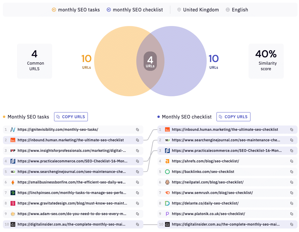 For example, are the search results similar for “monthly SEO tasks” and “monthly SEO checklist“, and should I target both queries on the same or different pages?