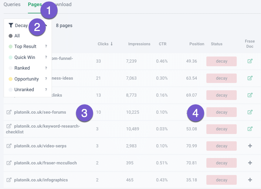 It’s easier to find decaying pages or queries with Frase SEO tools than Google Search Console; here’s how.