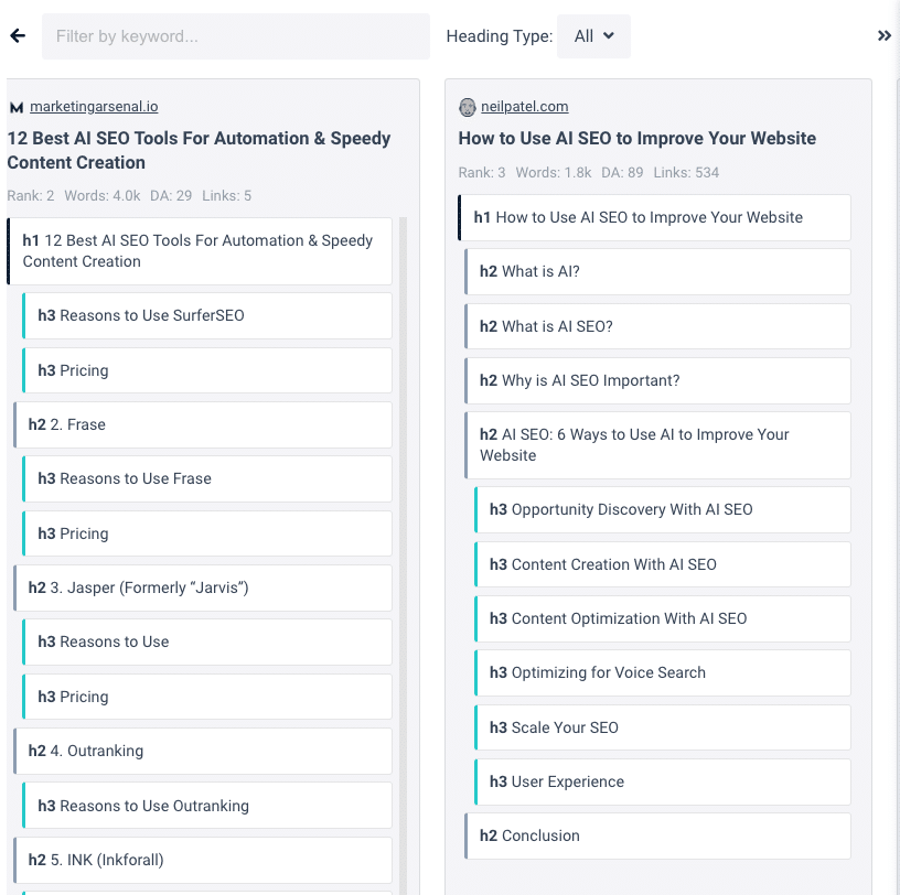 However, with Frase, I see summaries and details of top pages in one view, including the page titles, headings, questions, data and content snippets.