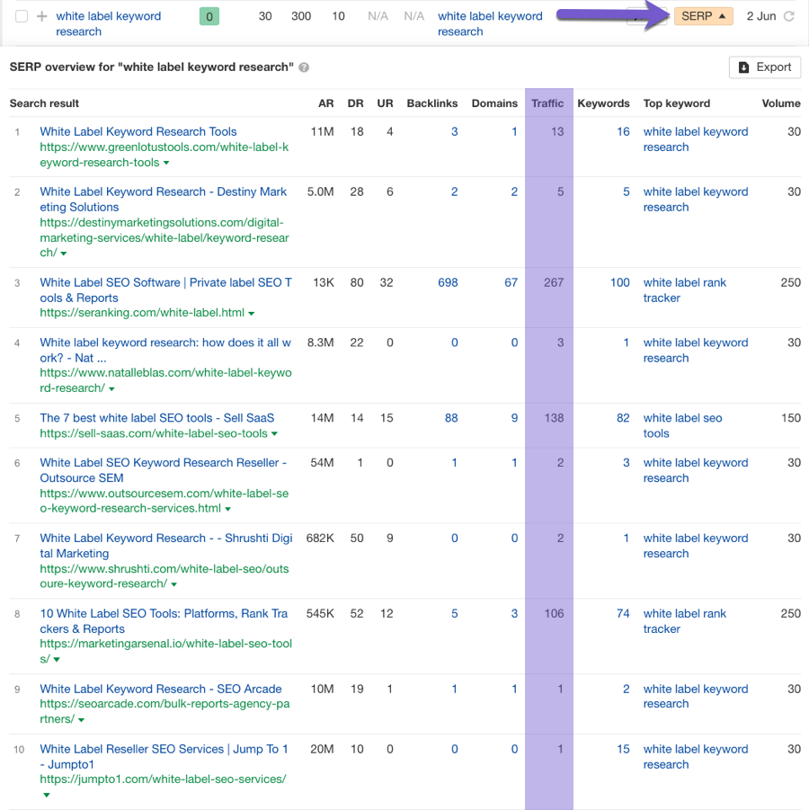 Now you can click the SERP button and see the estimated traffic to the top search engine ranking pages.