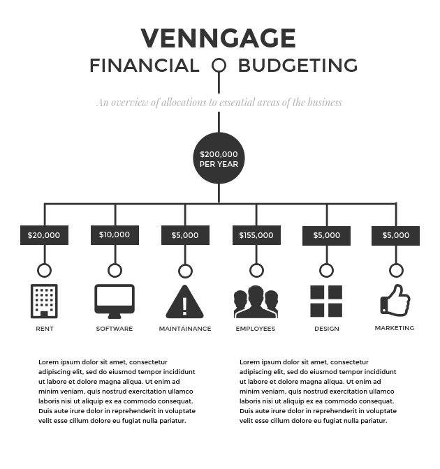 A better alternative to presenting a budget than a spreadsheet. Easy to understand, lots of white space against black text and images makes this infographic super simple.