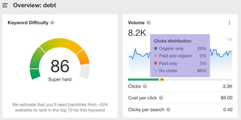 Ahrefs estimate that out of 8200 monthly searches, 66% of the searches result in no clicks.
