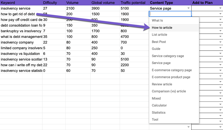 Search Google for each keyword in the template you wish to target and choose an option from the “Content Type” column that best matches the keyword.
