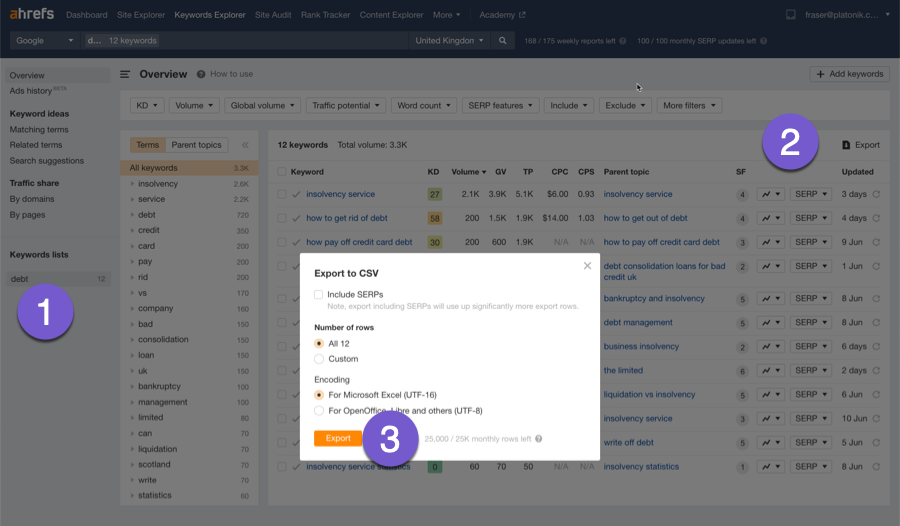 You can continue down the list of keywords and onto pages 2 and 3 until you’ve exhausted all relevant keywords.