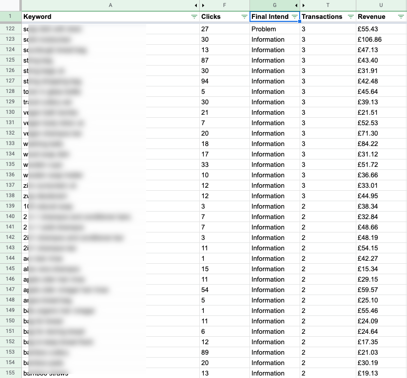 I have a Google Sheets automation tool that helps me figure out the user intent or stage in the buying funnel for each query.