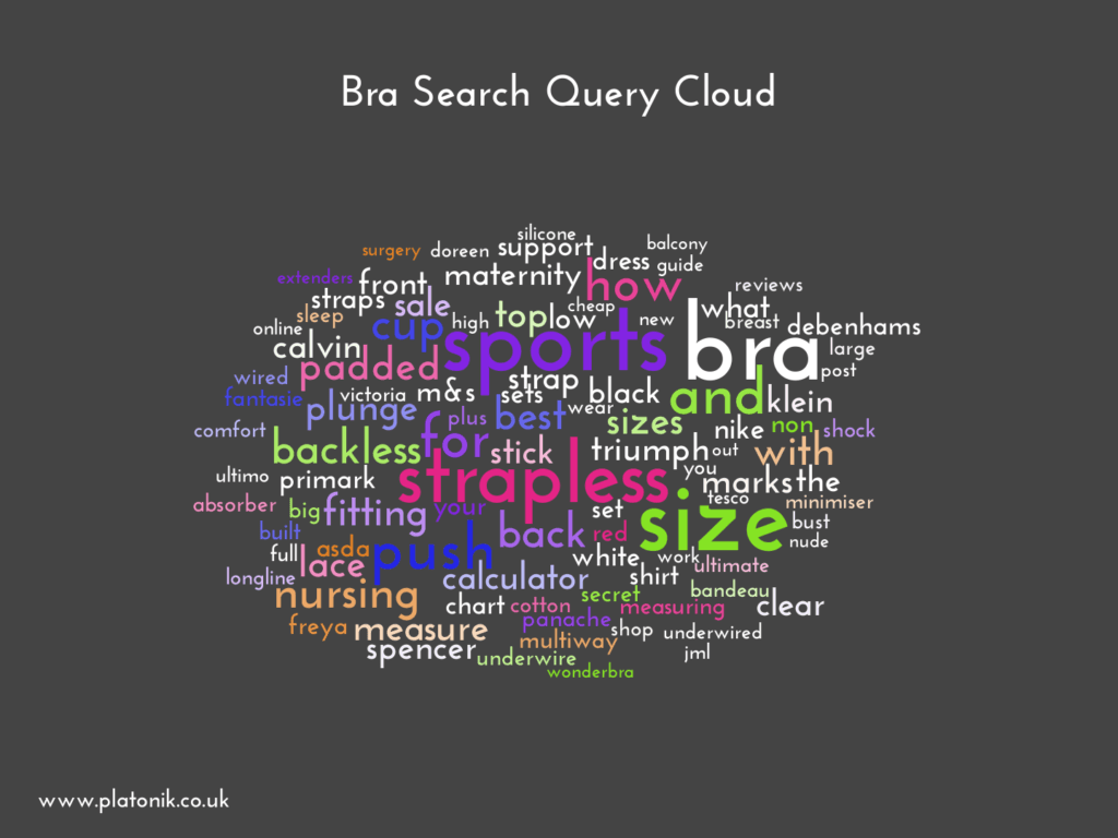 When you examine the top UK informational search queries containing “bra”, you see patterns, trends, and topics emerge about what is most prominent.