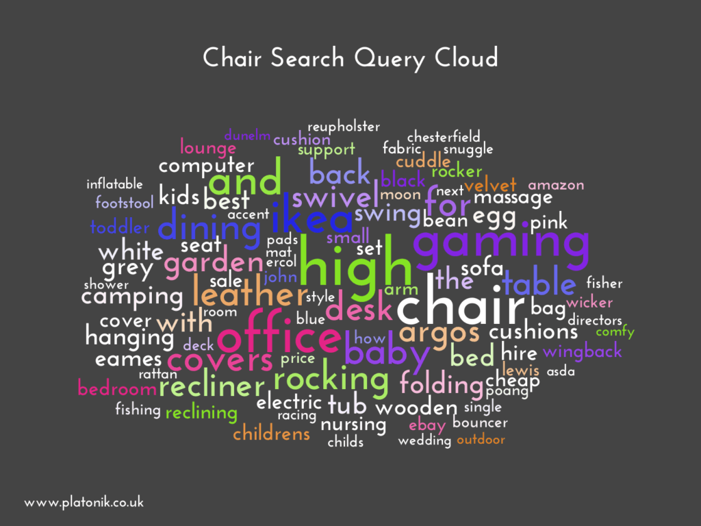 When you examine the top UK informational search queries containing “chair”, you see patterns, trends, and topics emerge about what is most prominent.