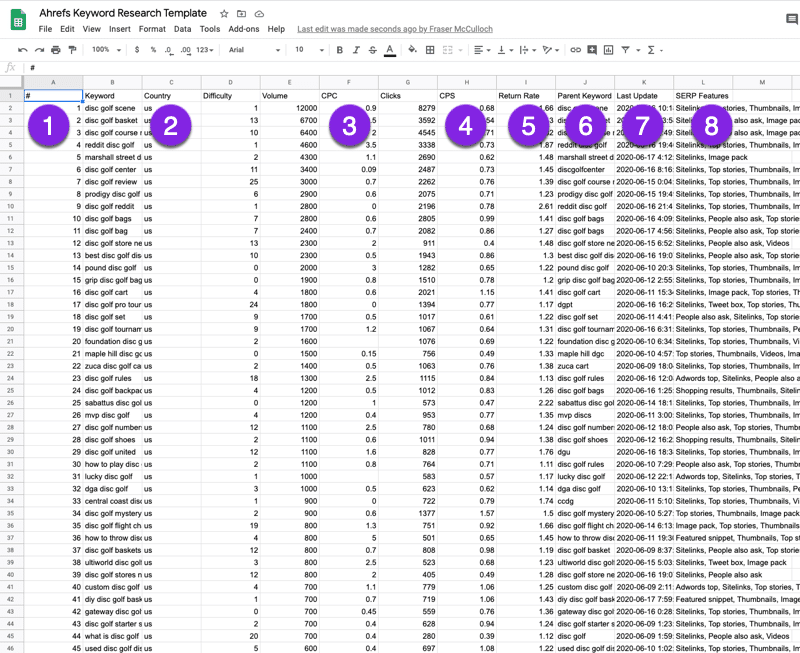 The first step is to export your keyword list from Ahrefs and import the data into a blank sheet in Google Sheets.