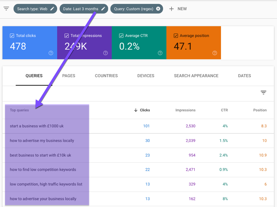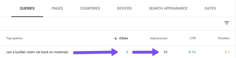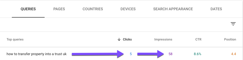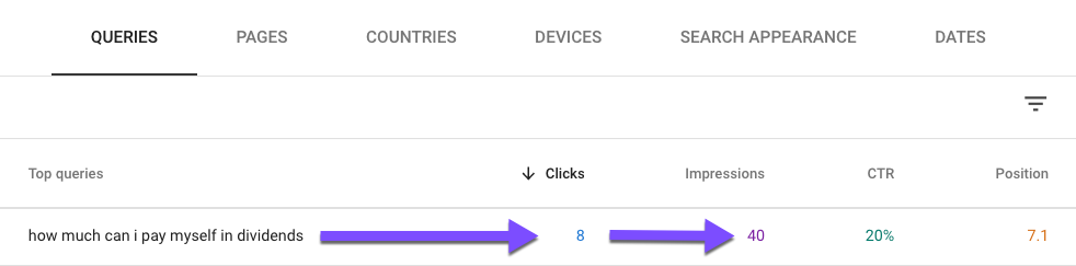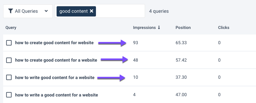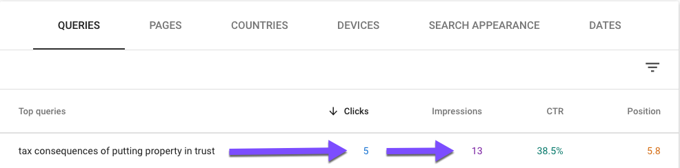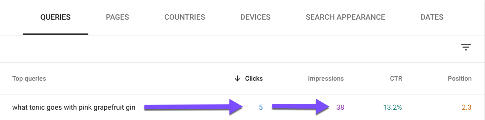 You’ll see the clicks, impressions (searches), CTR, and position of each query.