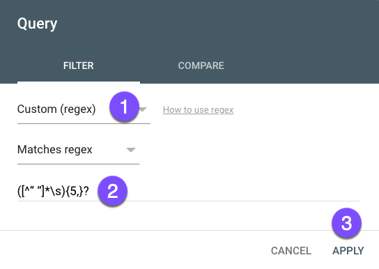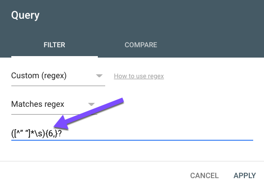 To show long-tail variations with 7 or more words, click the query box and change the digit in the formula to 7 or more.