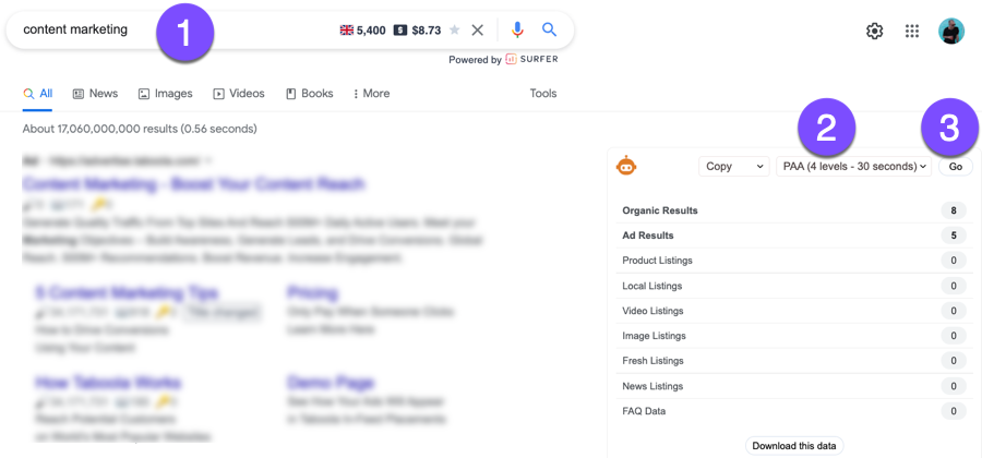 Jot down the relevant ones or store them in the Keyword Surfer clipboard and export them when you’ve done all your research.