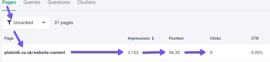 According to Frase Content Analytics, my page about website content is unranked; it’s poorly ranked, and every keyword is in a high position.
