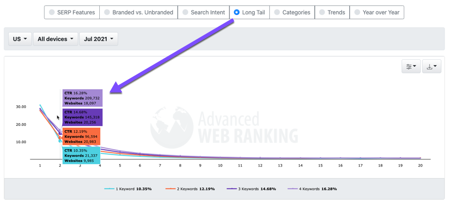 Advanced Web Ranking has studies of millions of keywords and from thousands of websites that show the long tail will generate a higher click-through rate than the short-tail keyword.