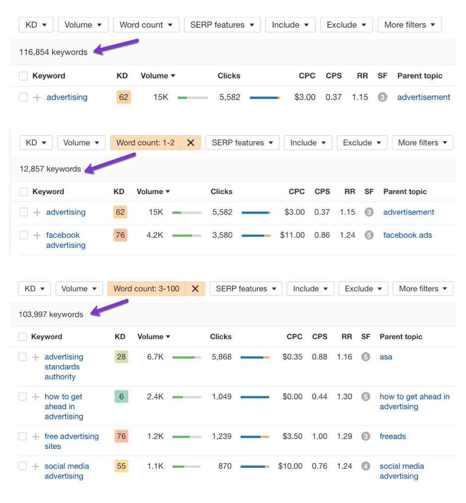 - There’s 116,864 phrase match keywords that include “advertising”
