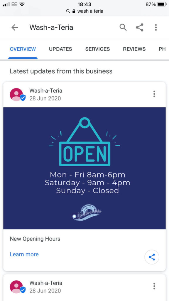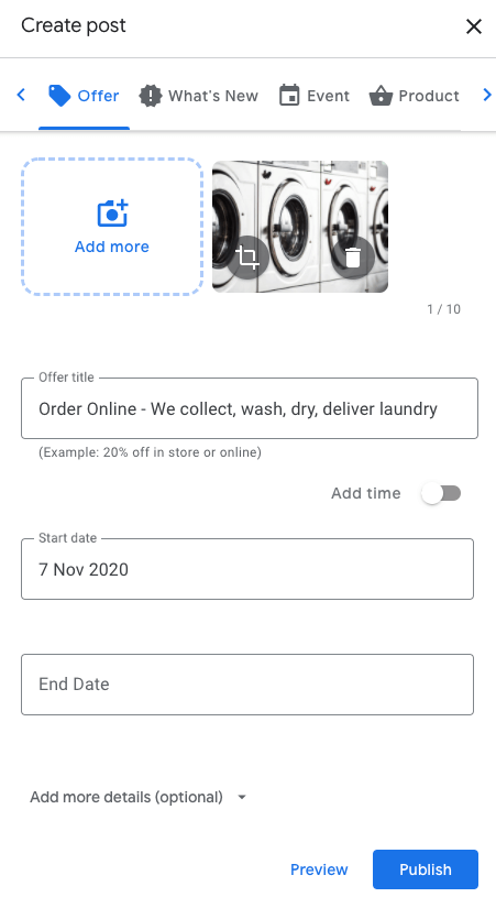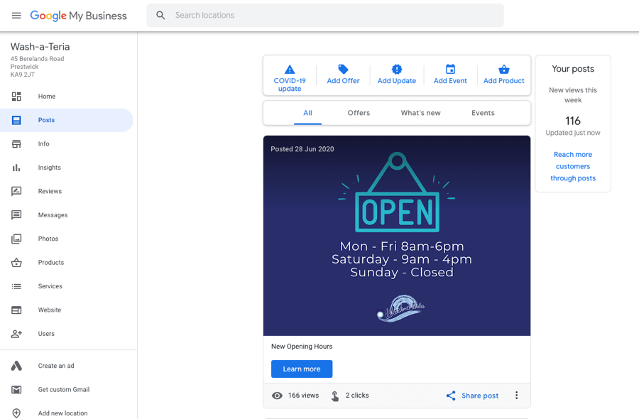Google Posts appear in search results when people search your company and are used to promote your offers and communicate news.