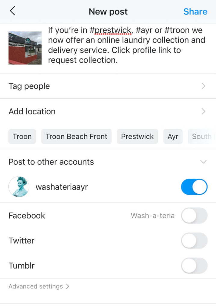 Finish the rest of your text; from the location box, add the location and share the post to your Facebook page as well.