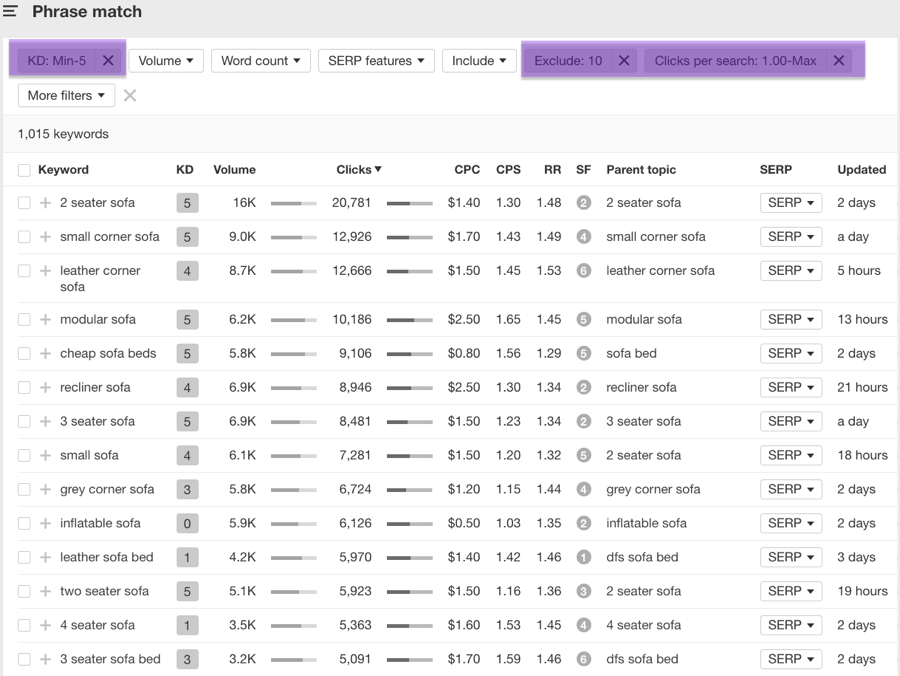 Your best chance of ranking is to find pages in the top results that have clicked, don’t have many links to their web page and their Domain Score (DS) aren’t all high.