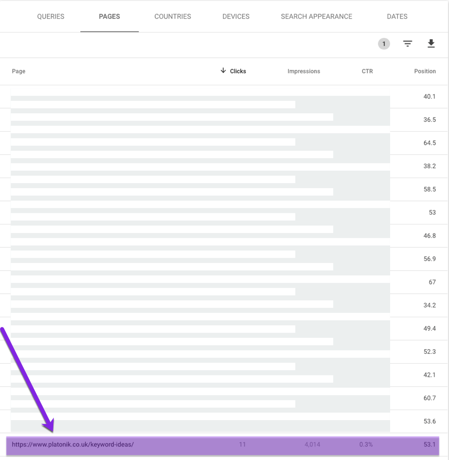 Ensure the clicks, impressions, CTR and average position boxes are selected and highlighted, then press pages.