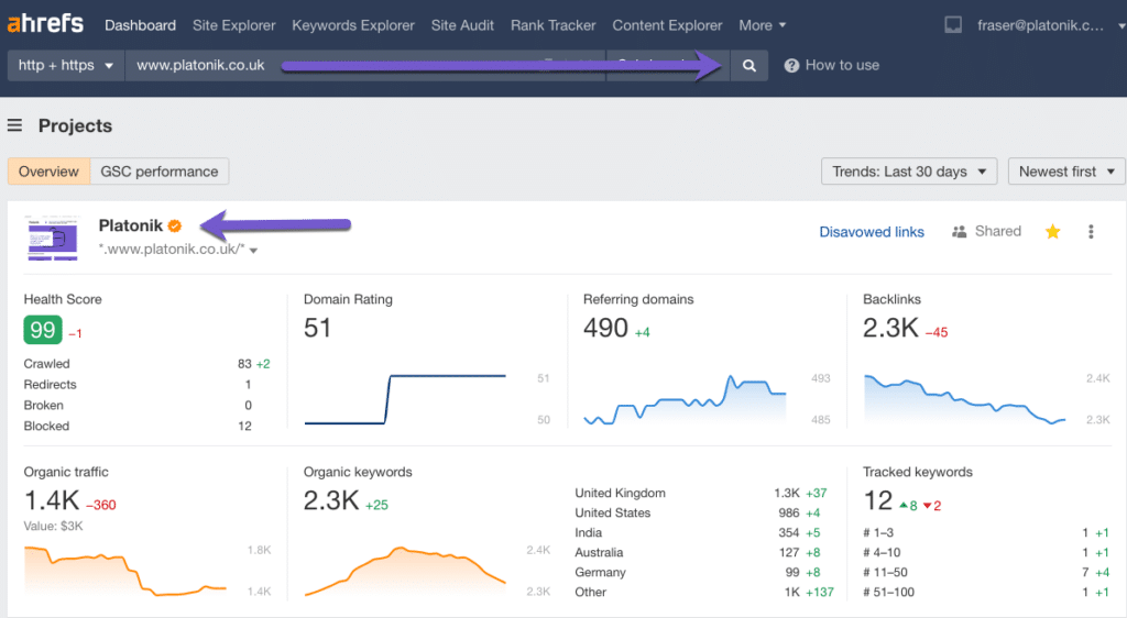 Step 1: Pop my domain name into Ahrefs site explorer