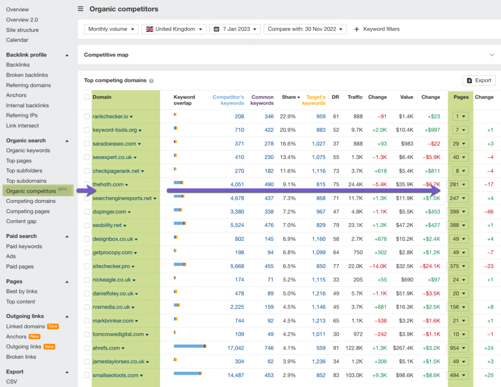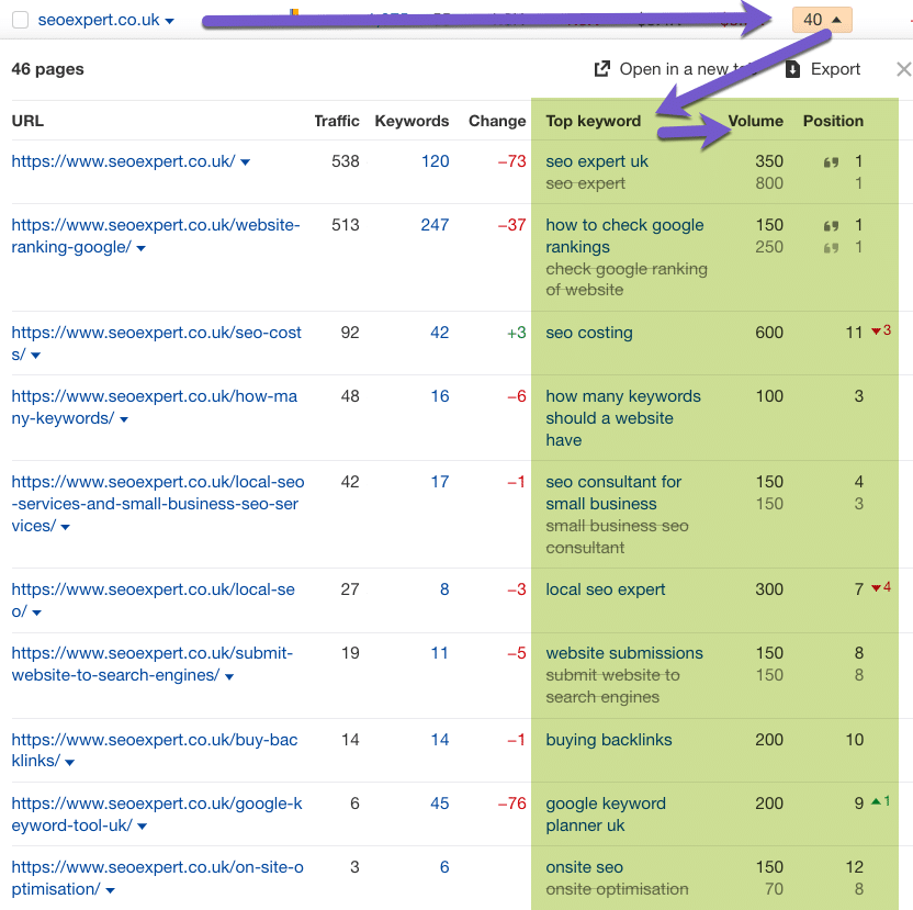 To view the top keywords, monthly search volume and ranking position, click the dropdown under each competitor’s page column.
