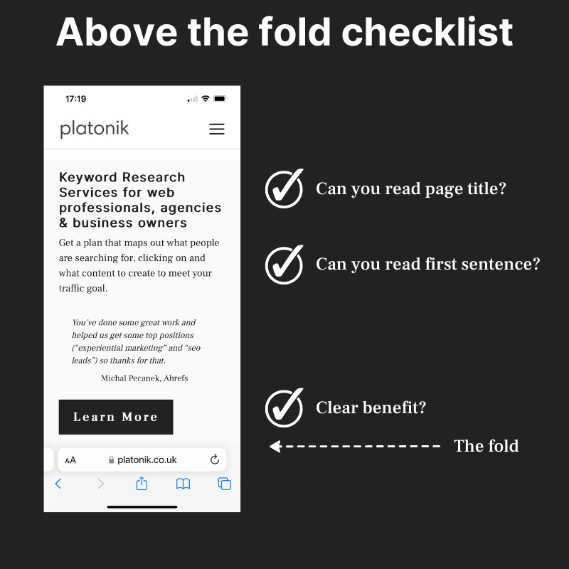Here are best practice examples above the fold elements you should have on home pages, e-commerce categories, e-commerce pages, service pages and blog posts.