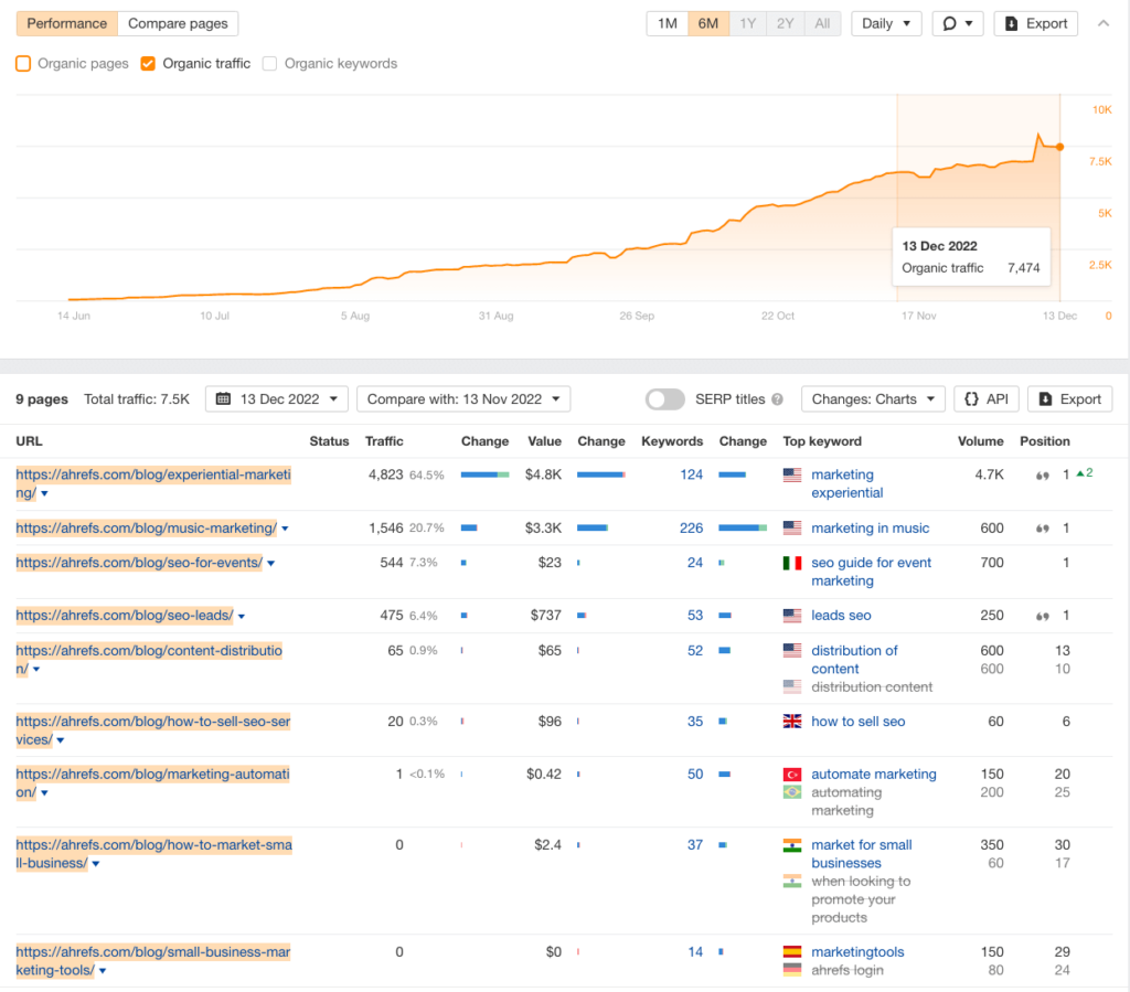From this Ahrefs screenshot, I’ve driven over 7500 organic visits to the Ahrefs website and secured them 4 number 1 positions from 9 articles I wrote.