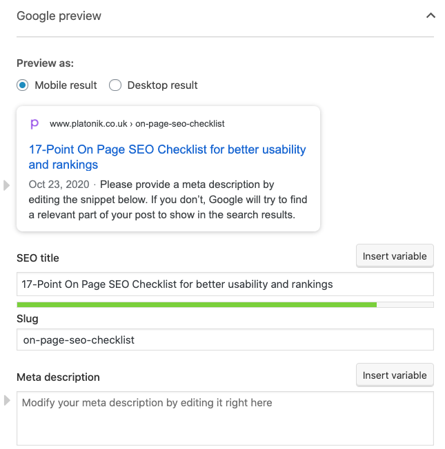 Then when I preview the page title in Yoast for mobile results, this length looks ideal.