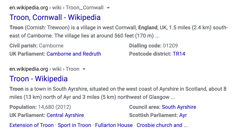 If I mentioned and linked out to the golf courses in Troon, then Google would know my page is about Troon in Scotland, not Troon in the southeast of England.