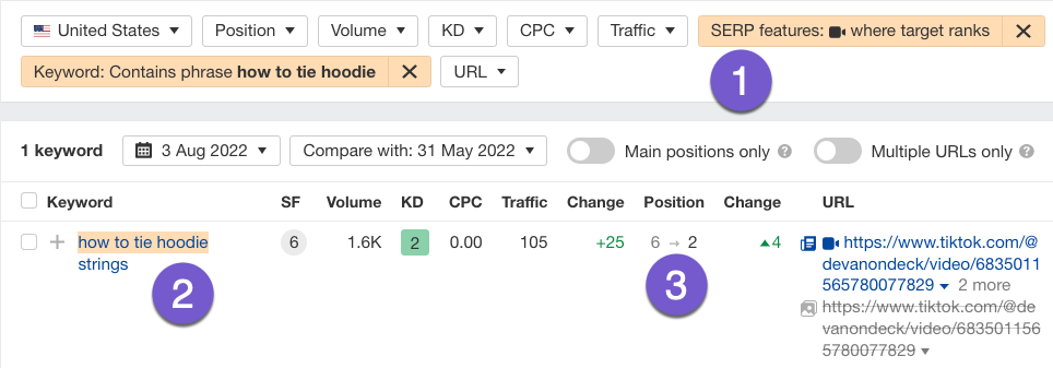 This study isn’t scientific; using Ahrefs, I looked at the USA and UK keywords that a TikTok video ranks in the top 10 of Google.