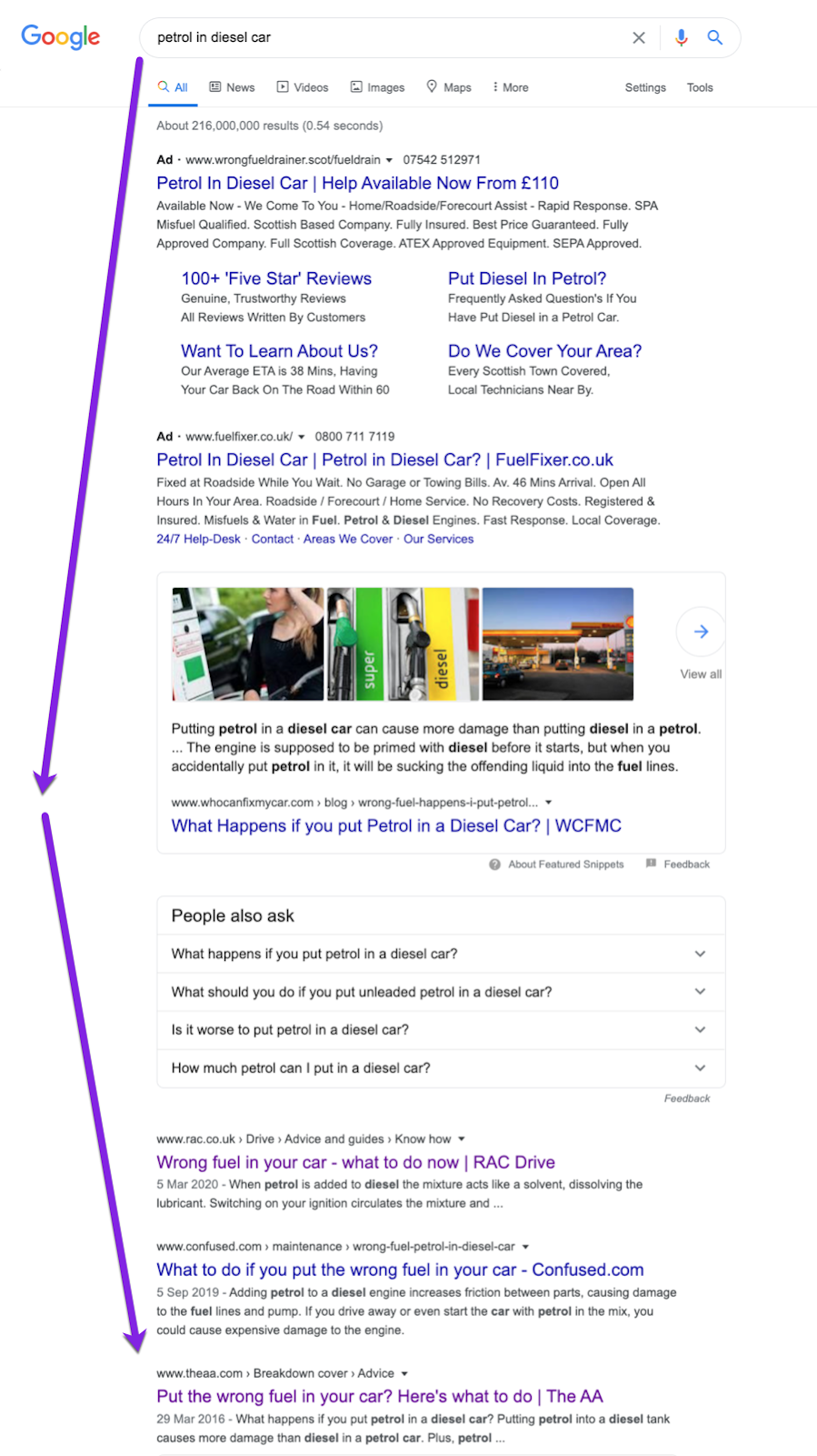 Looking at the top search results for “ petrol in a diesel car”, I noticed a well-known company.